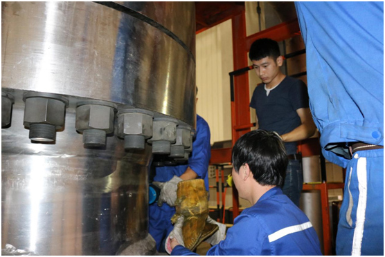 現(xiàn)場工作人員非常認(rèn)真地與波霆機械工程師進(jìn)行交流、探討以及學(xué)習(xí)液壓扳手的正確操作方法。培訓(xùn)剛剛結(jié)束大家就開始忙碌起來,對應(yīng)兩個法蘭現(xiàn)場工人分成兩組,每組三個人,采用兩同步拆卸螺栓。